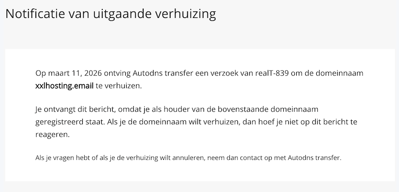During the conversion to the new system, a notification email may be sent to the domain name holder. This email is only sent for “general” domain extensions such as .com, .net, org and .shop (the so-called gTLDs). For country extensions such as .nl, .be, .de and .eu, this mail is not sent.